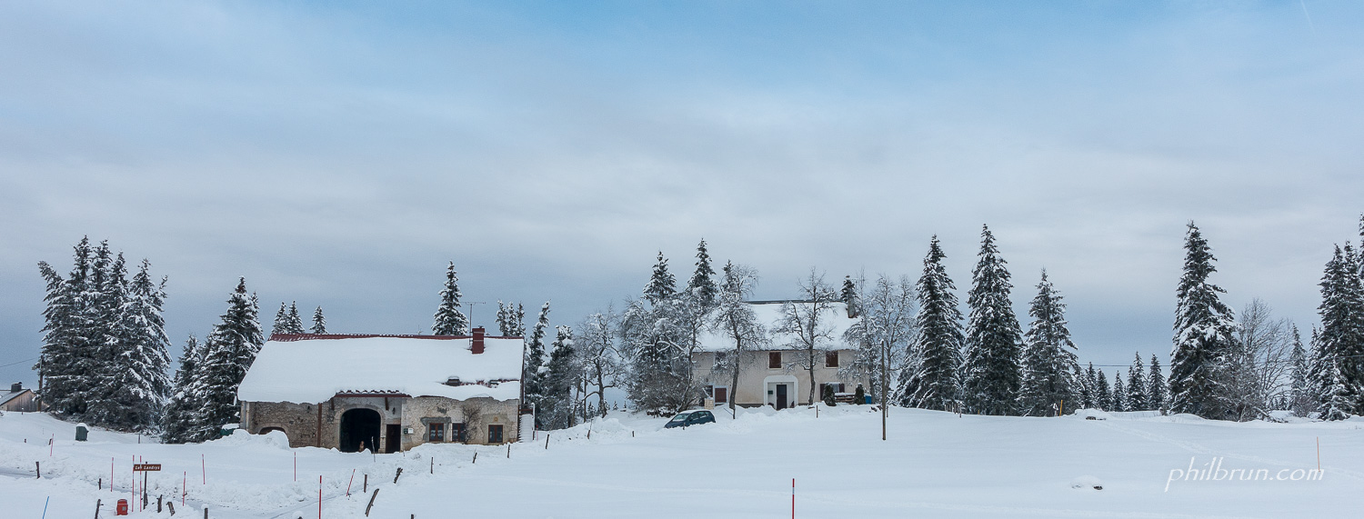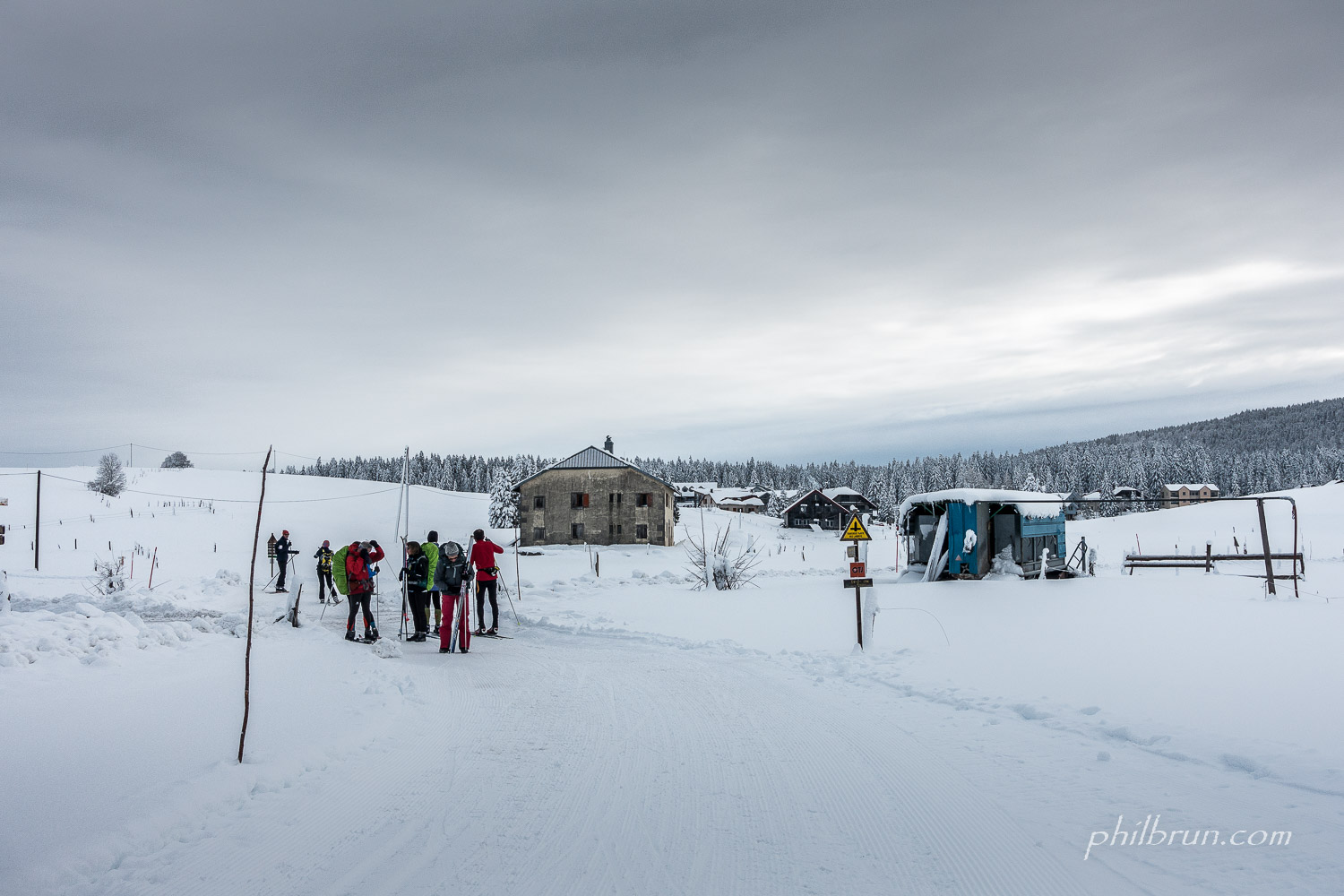 Lundi matin, c’est le départ. Après un excellent petit déjeuner à l’hôtel des Sapins, les thermos remplis, nous bouclons nos sacs et chargeons la voiture pour nous rendre au départ des pistes de Longeville le Haut, à quelques kilomètres au-dessus de l’hôtel. Cela nous permet de partir à une altitude où la neige est présente. Nous nous doutons néanmoins, qu’en descendant sur Mouthe, la neige risque de nous faire cruellement défaut…