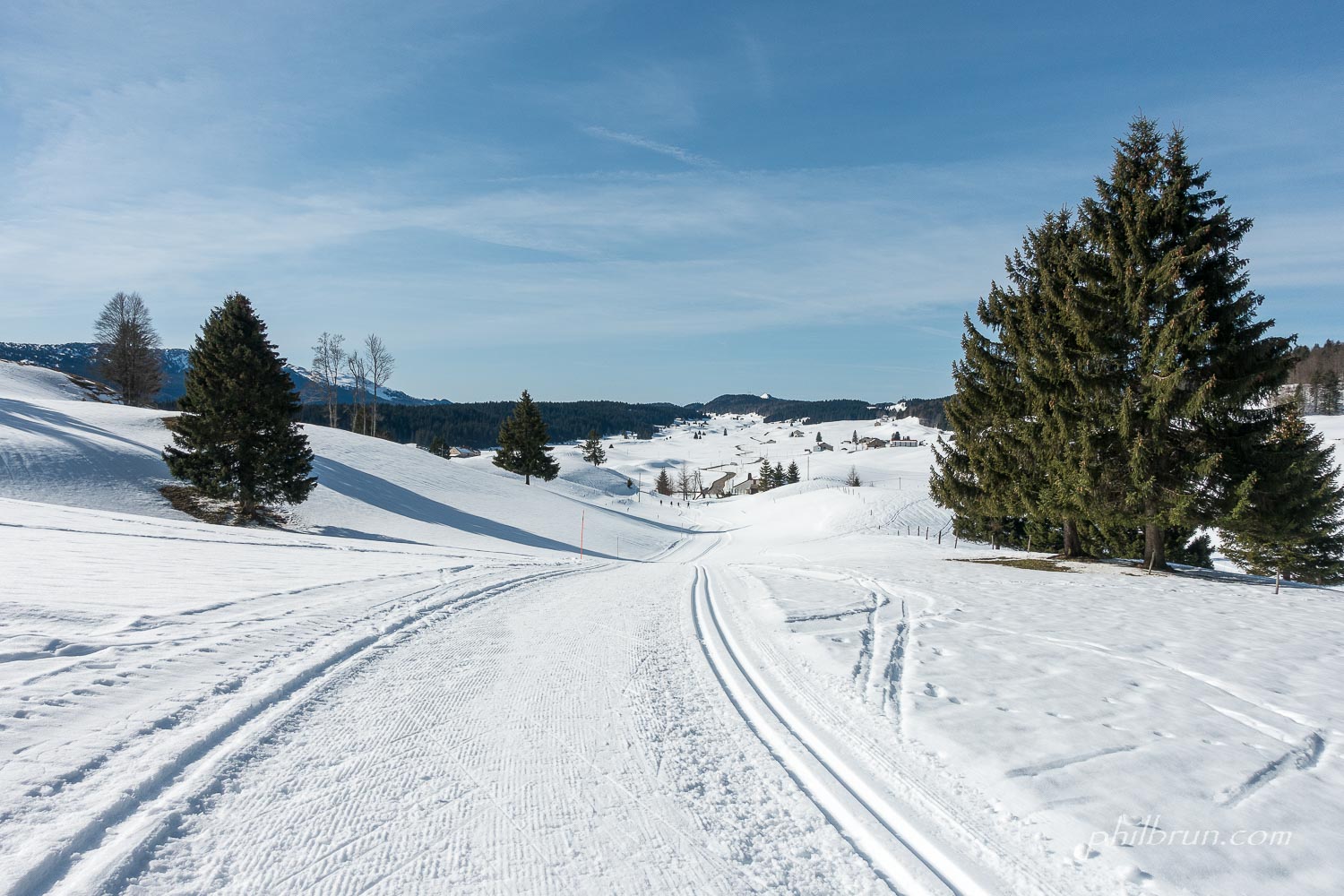 Samedi matin, le soleil est toujours de la partie pour attaquer notre dernière étape. Direction Giron, où notre taxi (l’agence Roule ma Poule) nous récupérera pour nous ramener au point de départ, Métabief. Ou plus exactement, au départ du télésiège de Longeville le haut, où notre voiture nous attend sagement. Cette étape est la plus longue du séjour, avec ses quelques 25 km. Le départ est constellé de petites descentes gelées qui ne sont pas du goût de tous !
