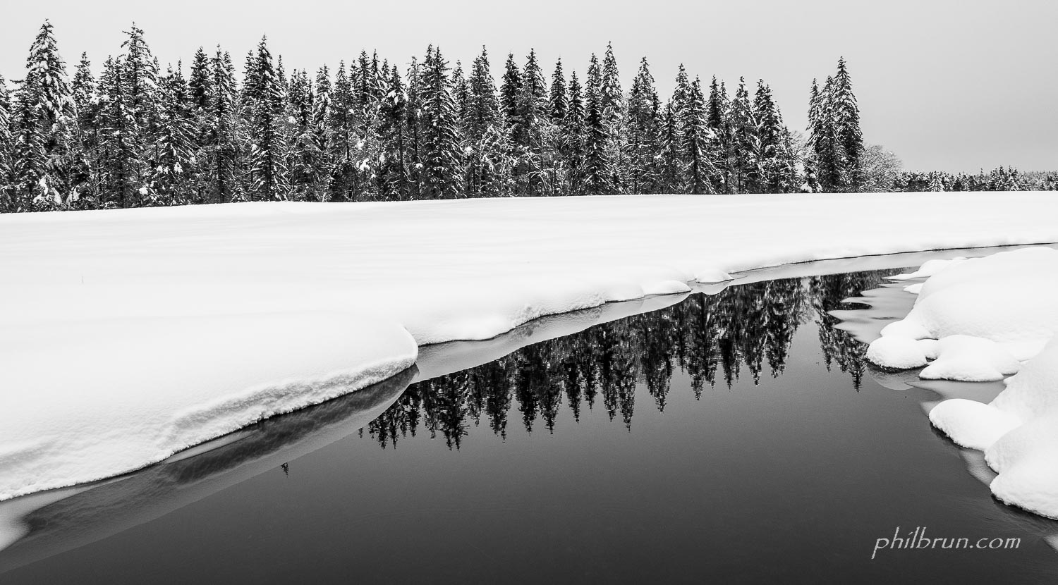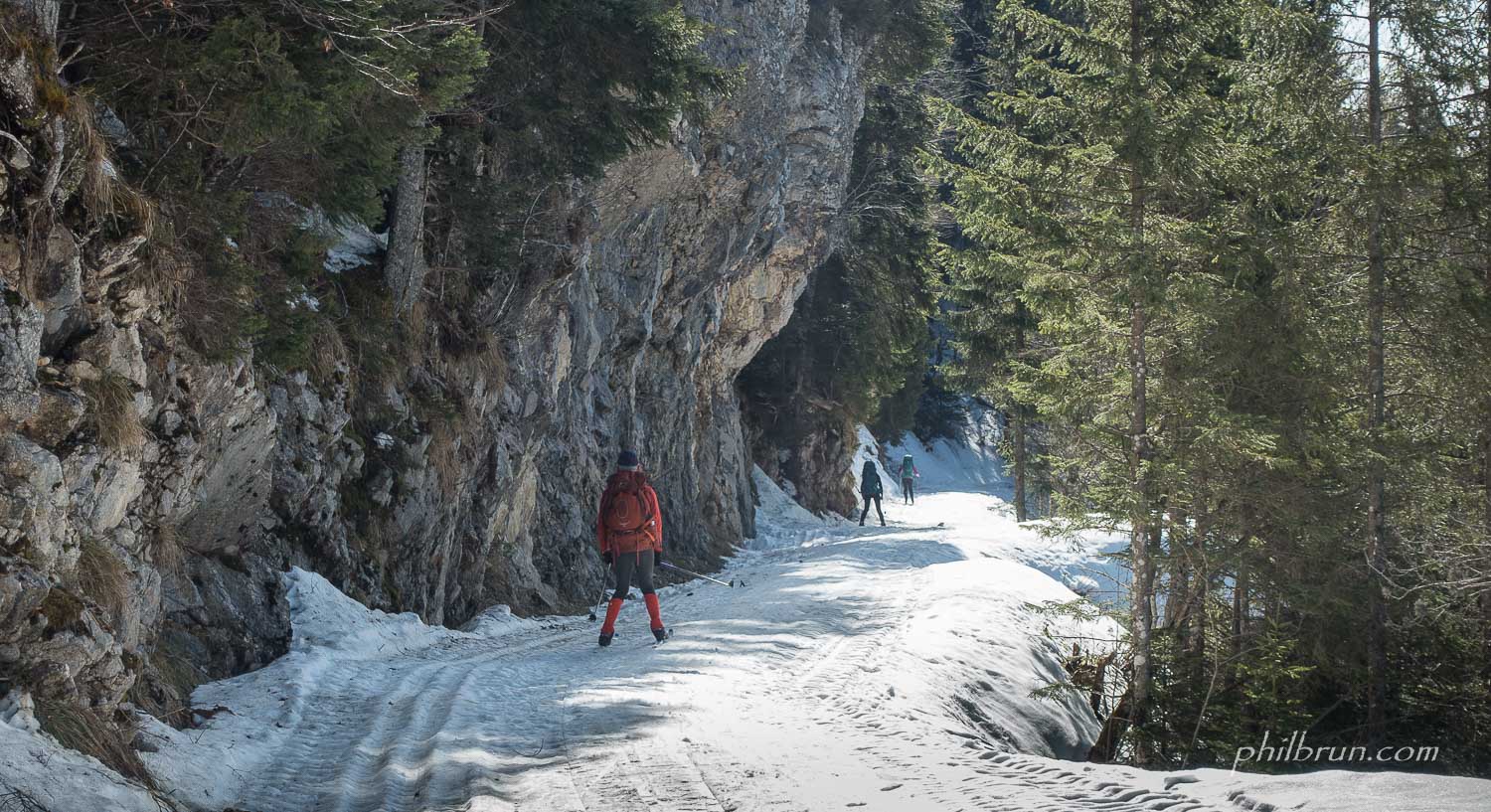 Tout le début de la ballade se fait sur de la neige, mais avec un temps menaçant. Puis la descente sur Mouthe arrive et là, les choses se compliquent. Le manque de neige nous fait chuter durement sur la route forestière pleine de cailloux occasionnant quelques dégâts aux mains et aux vêtements. Après avoir déchaussé, nous terminons notre descente sur Mouthe, sous une pluie diluvienne, où nous arrivons trempés jusqu’aux os !