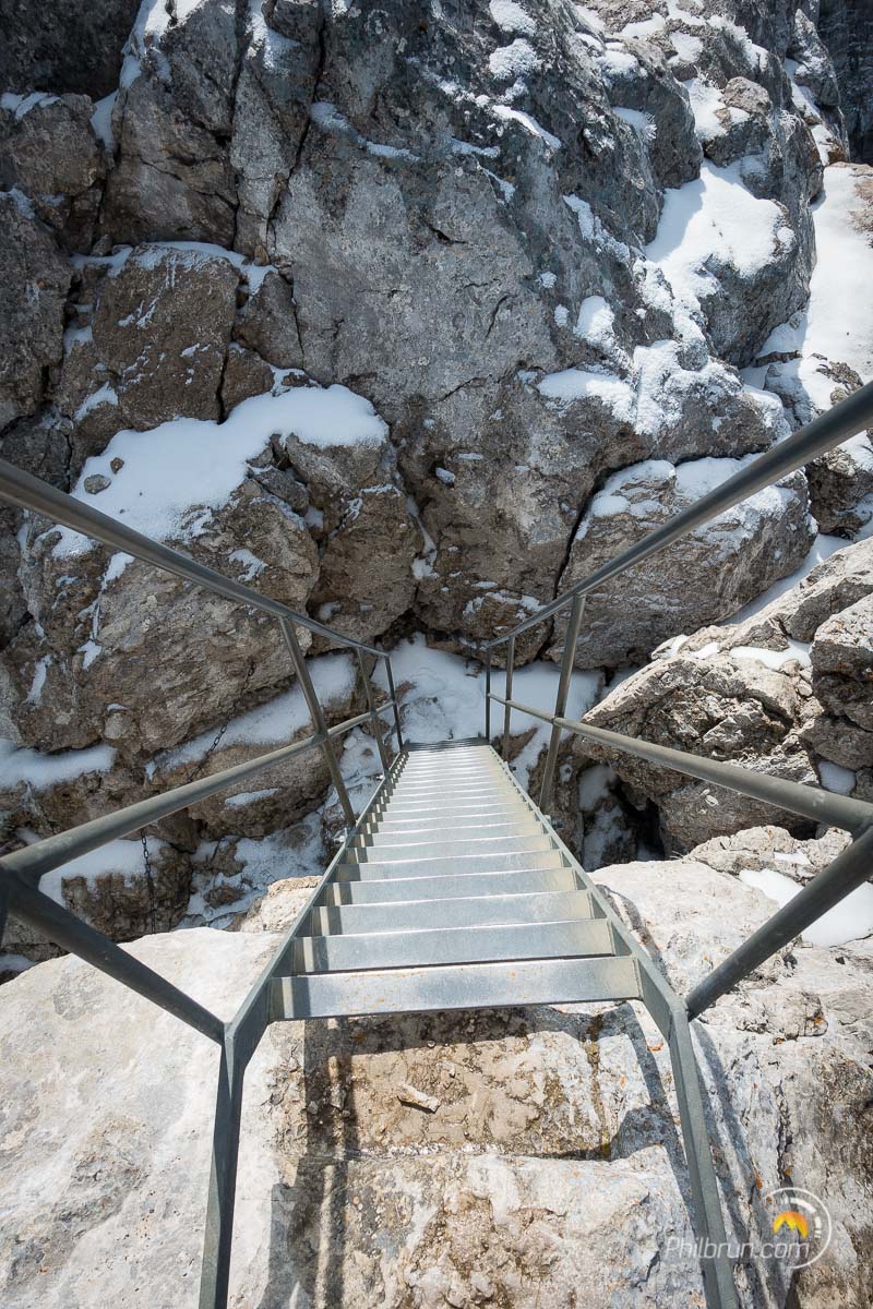 Il faut alors contourner le rocher sommital par l’Est puis, il reste à franchir une petite paroi équipée d’échelles et de chaines afin d’arriver au sommet.