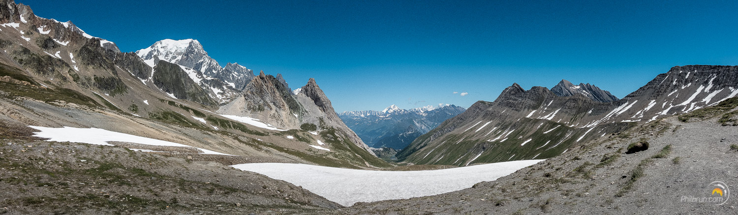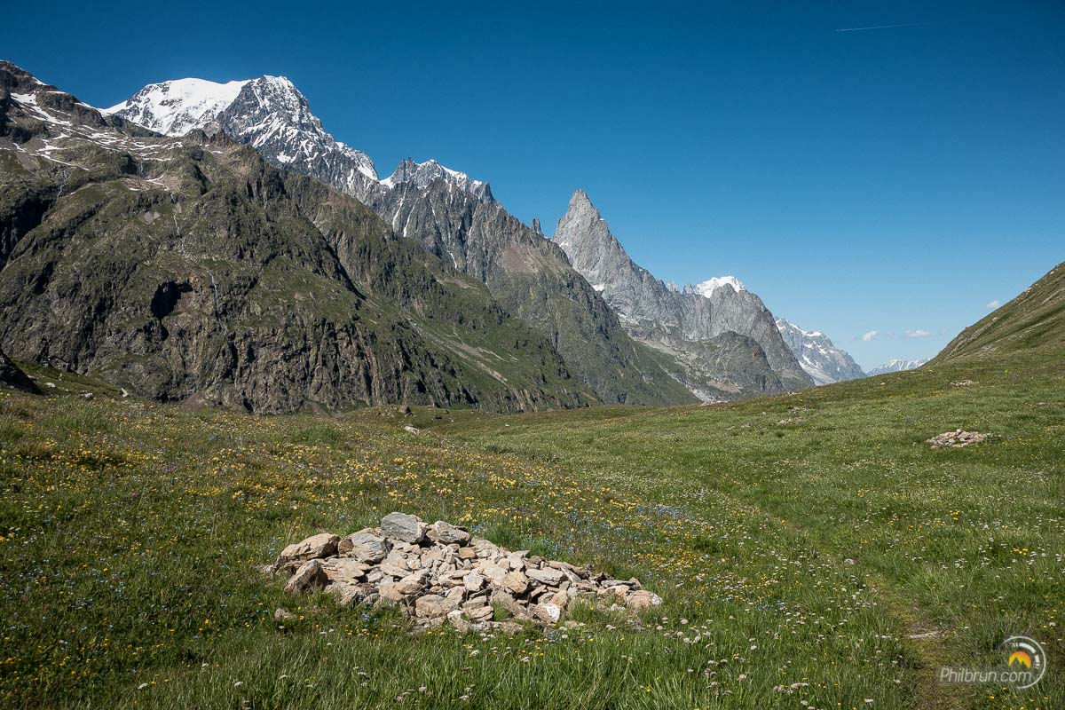 Le col nous offre notre première vision du versant Italien du Mont Blanc et nous en profitons pour nous restaurer avant d’entreprendre la descente vers le refuge Élisabetta. Thierry et moi en profitons pour se faire un troisième col dans la journée. Nous laissons les autres descendre directement vers le refuge. Quant à nous nous obliquons à droite pour prendre le sentier qui mène au col des Chavannes. Il permet de prendre un peu de recul et d’offrir ainsi une vision somptueuse de ce versant du Mont Blanc.