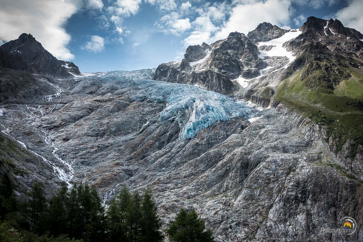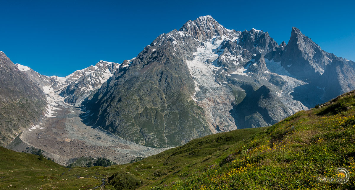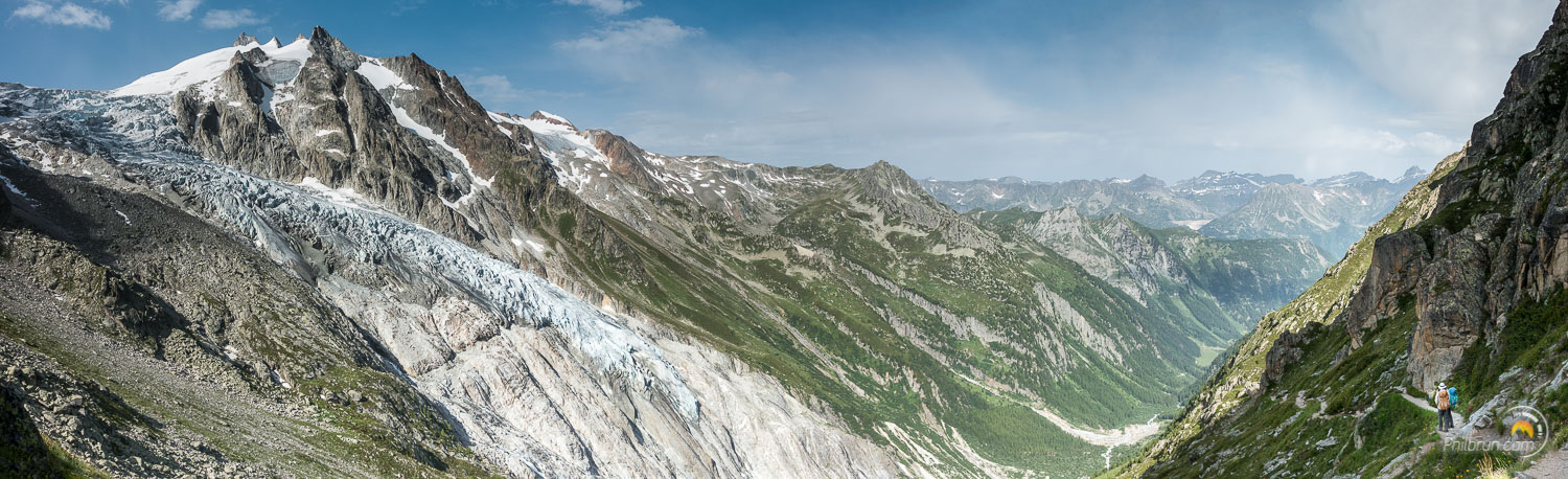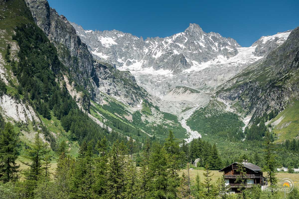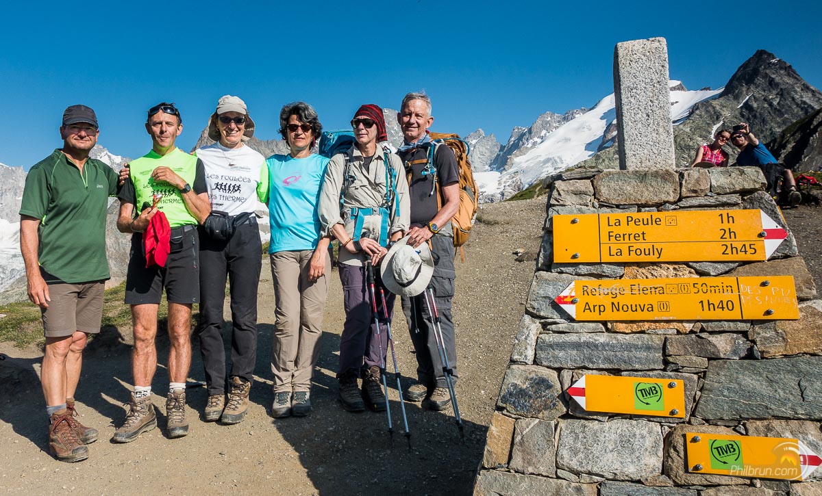 Le bus nous a déposé au fond du val Ferret. Il ne nous reste alors plus, qu’une quarantaine de minutes de montée, pour arriver au refuge Éléna. Il est planté dans un paysage de haute montagne à couper le souffle. Une grande terrasse le borde, sur toute sa longueur, face au magnifique glacier de pré de bar et au sommet du Mont Dolent. Nous passerons un long moment sur cette terrasse à contempler ce splendide paysage.