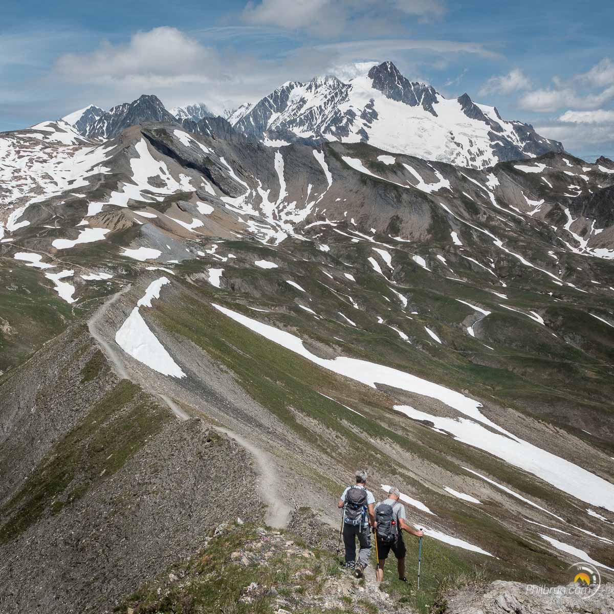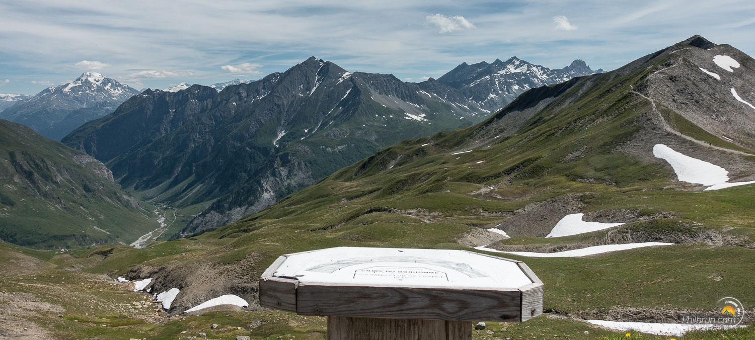 Après la Balme, le chemin se transforme en sentier et nous quittons peu à peu la moyenne montagne pour la haute. Nous traversons alors notre premier névé. Puis, après avoir taquiné quelques marmottes, nous atteignons le col de la croix du Bonhomme. Nous y faisons une pose restauration pendant laquelle nous profitons du paysage somptueux qui nous est ici offert.
