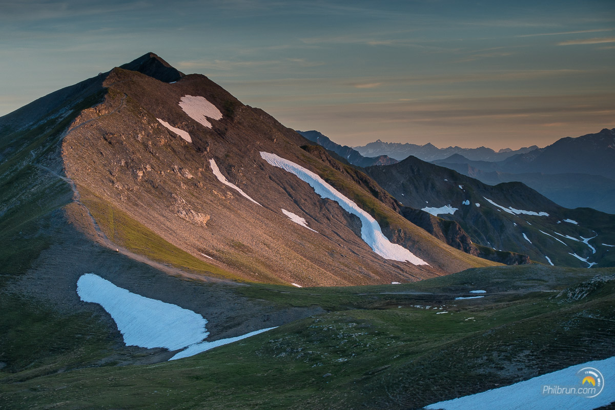 Tartines avalées et brodequins lacés, nous entamons la montée dans le vallon, frontales allumées. Nous finissons notre nuit, en marchant dans le petit jour qui se lève timidement et nous sommes au deux tiers de la pente lorsque le jour se lève totalement.