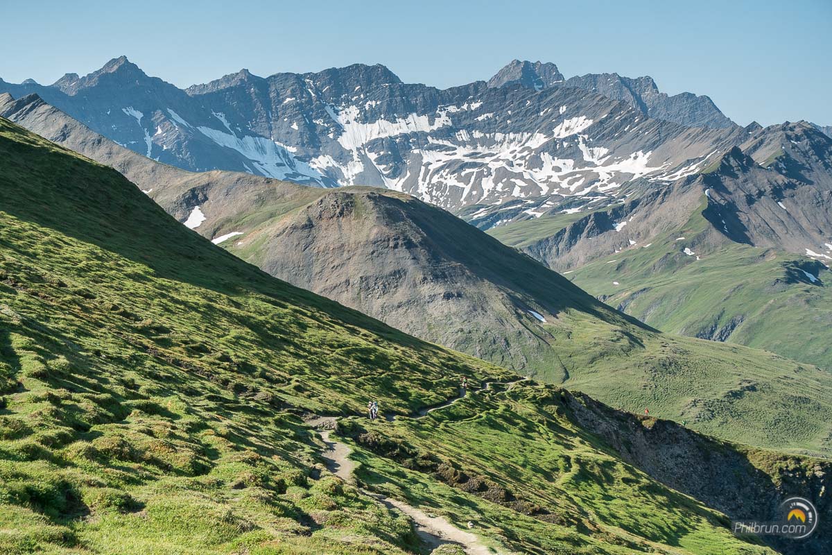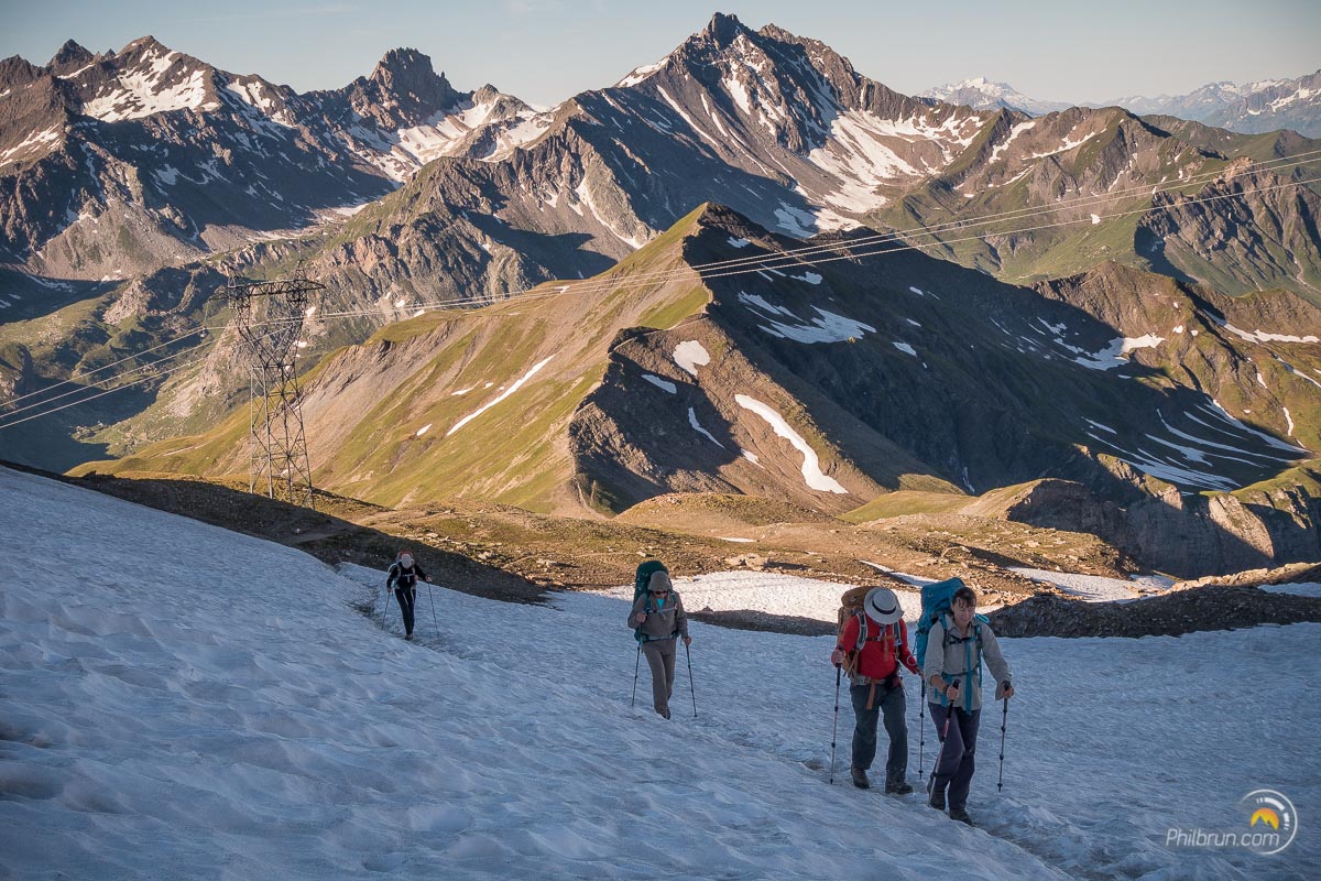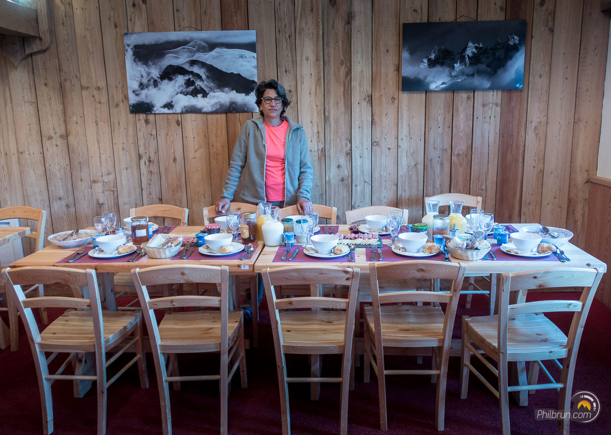 Pour le départ ce matin, petit-déjeuner à 7h. Impossible de l’avoir plus tôt…Une fois, cet indispensable starter avalé, nous repartons par le col de la croix du Bonhomme afin de prendre la variante du col des Fours. Variante, qui offre un passage en haute montagne de toute beauté.