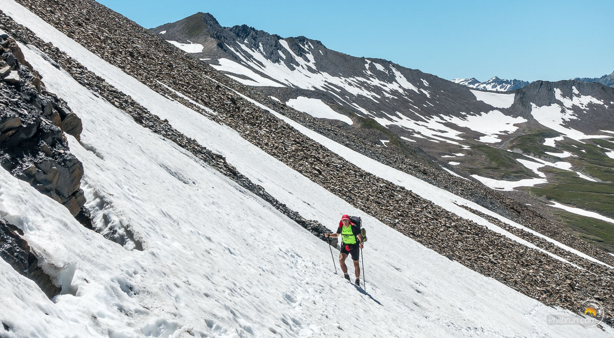 Névés et pierriers, sont au rendez-vous des deux versants de ce col. La descente, se fait le long d’un torrent de fonte pour le moins chargé. Nous atteignons enfin le fond de vallée à la Ville des Glaciers où nous apercevons le second col de la journée, le col de la Seigne. Il fait chaud, très chaud et la montée nécessite un réapprovisionnement en eau que nous buvons bon train sans jamais uriner 😱. Ce col aura puissé dans l’énergie de certains, qui seront vraiment content d’arriver sommet. En effet, la chaleur amplifie innévitablement la fatigue.