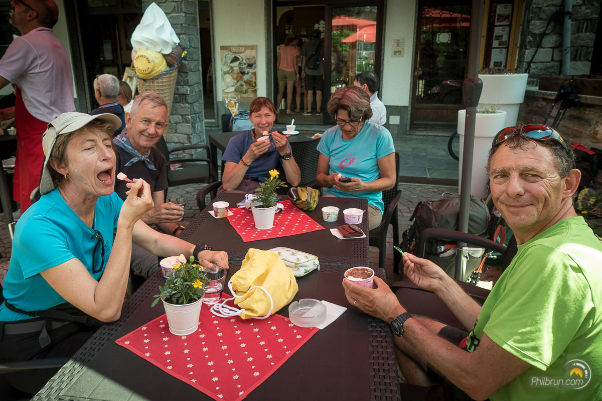À Courmayeur, nous faisons quelques courses et surtout nous en profitons par cette chaleur pour nous offrir de délicieuses glaces. Une bonne glace à l’italienne, chez le spécialiste local c’est vraiment à ne pas louper !