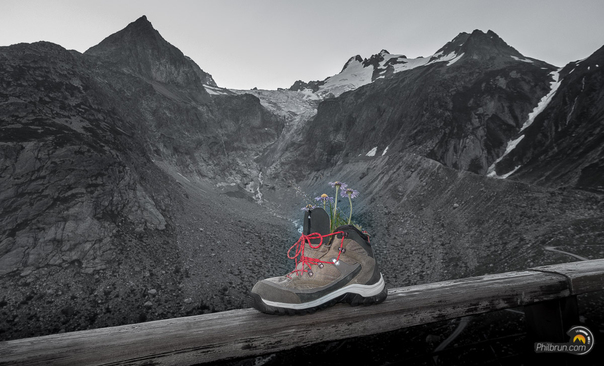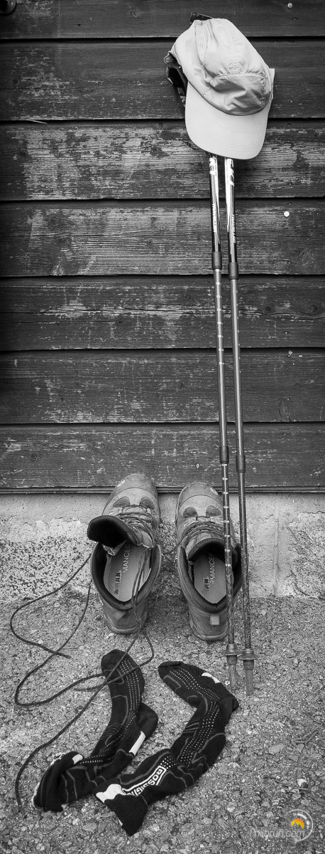 Par contre, pour moi, la priorité sera cet après-midi là de recoller mes semelles, sur les deux chaussures. Et oui, en fait l’aléa s’est révélé plus grâve que prévu. Le lendemain, il faut vraiment que cela tienne, car on part pour la variante de la fenêtre de l’Arpette. Variante la plus physique et la plus longue, mais aussi une des plus belle de ce tour du Mont Blanc.