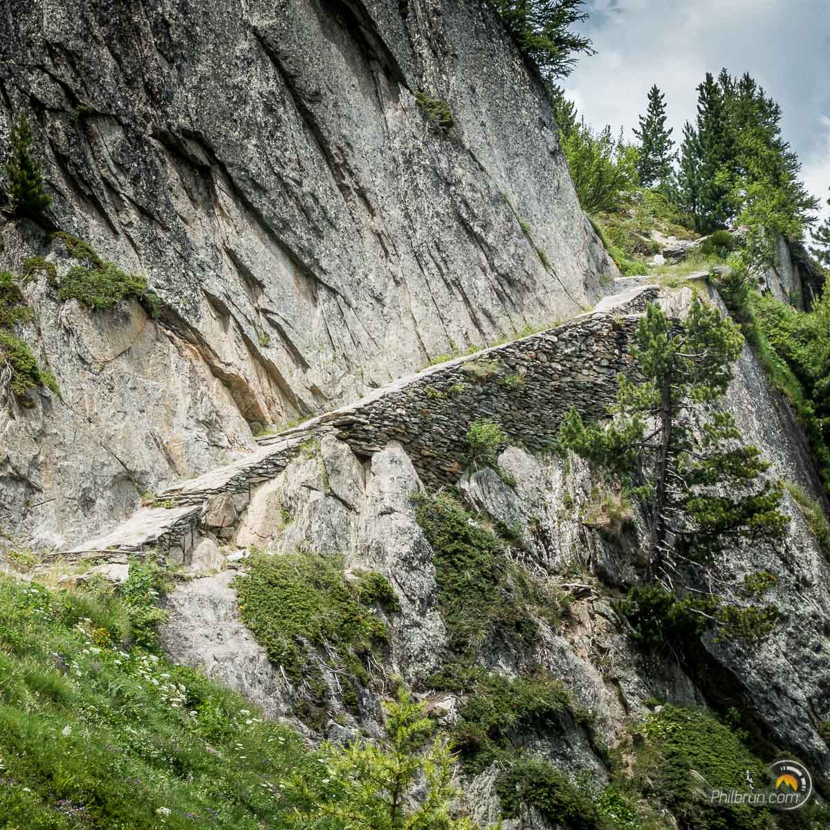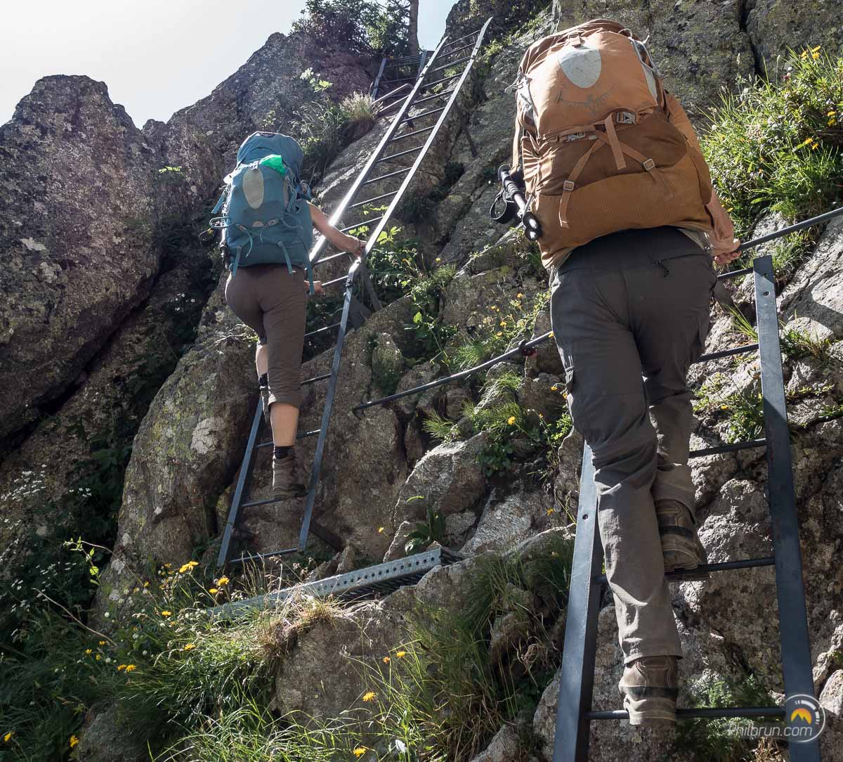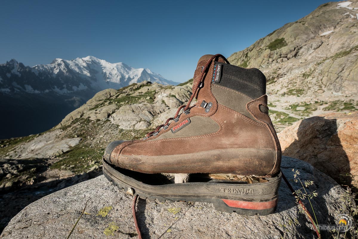 Pour moi se sera la « surprise », aux pieds des échelles. Mes fidèles brodequins m’indiquent que la tenue du pied gauche, se relâche… Je regarde de plus prêt et je m’aperçois effectivement que la semelle est ouverte sur tout le côté à la jonction avec la chaussure ! Je me retrouve donc avec les pieds à découverts ! Cette fois, c’est incontestablement la fin. Il me faut donc passer au plan B et sortir mes roues de secours. Après analyse, en fait les deux chaussures ont rendu les semelles ! Il me faudra donc investir pour la prochaine randonnée. Mais à bien y regarder, finalement je ne m’en sort pas si mal car elles ont tenues quasiment jusqu’au bout de cette rando. En effet, à cet endroit, il ne me reste qu’environ deux heures de marche pour finir notre tour du Mont Blanc !