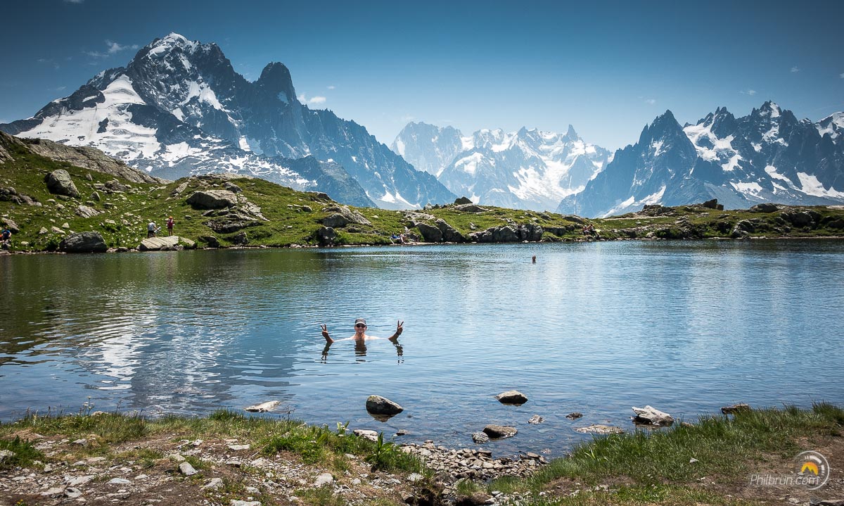 Puis, nous arrivons sur le bord des petits lacs de Chéserys en contrebas du refuge du Lac Blanc où nous allons passer la nuit. Échanges de plaisanteries sur sentier avec les randonneurs au sujet d’une baignade, que l’on imagine tous impossible en cette saison, tant l’eau doit être froide. Puis, nous décidons d’obliquer vers le bord du second lac. Je trempe la main dedans et surprise ! Trois minutes plus tard, nous barbotons en plein milieu du lac, dans une plénitude incroyable ! Quel panard au pied du Mont Blanc ! L’eau était tellement bonne que personnellement je resterais un demi heure dans l’eau. Un kiffe total.