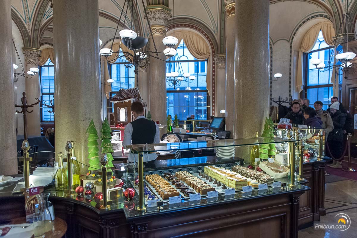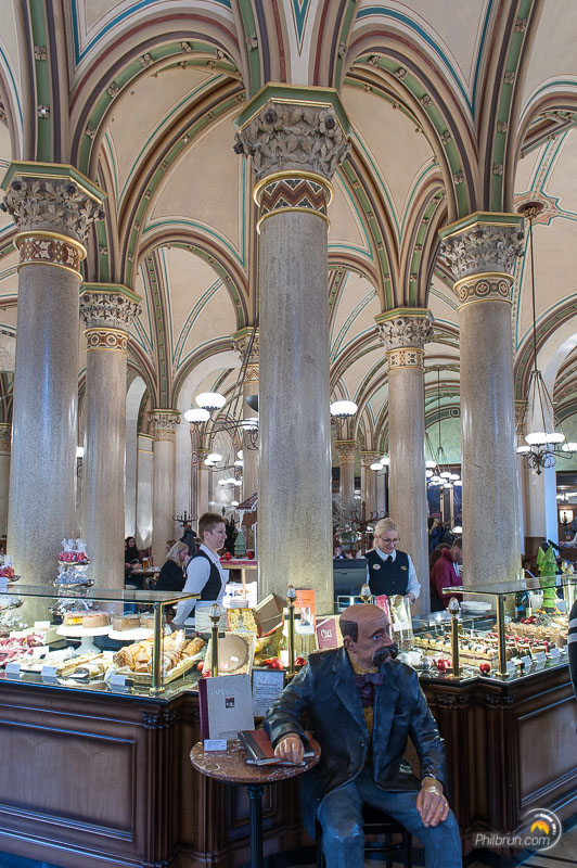 Voilà encore un lieu chargé d’histoire et qu’il faut vraiment visiter. Si tant est que ce terme soit approprié pour cet endroit, qui n’est autre qu’un café ! Il est vraiment prisé de tous les touristes et je vous recommande d’être stratège sur les horaires car sans quoi vous risquez d’attendre un moment avant de pouvoir y pénétrer. Un portier, en costume et chapeau melon, assure d’ailleurs la régulation des convives à l’extérieur avant le sas d’entrée.
